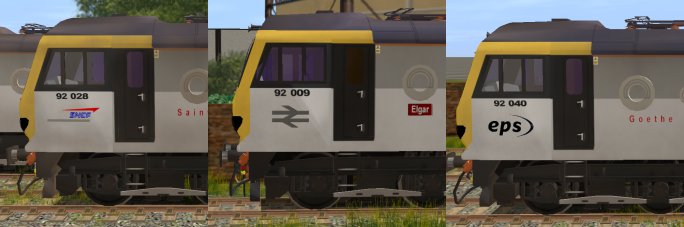 All of the class 92 locos have carried nameplates at some point in their lives. The model locos carry the appropriate name and nameplate style for the livery variant. The nameplates are automatically added to the model when a particular running number is selected either randomly or by the user.